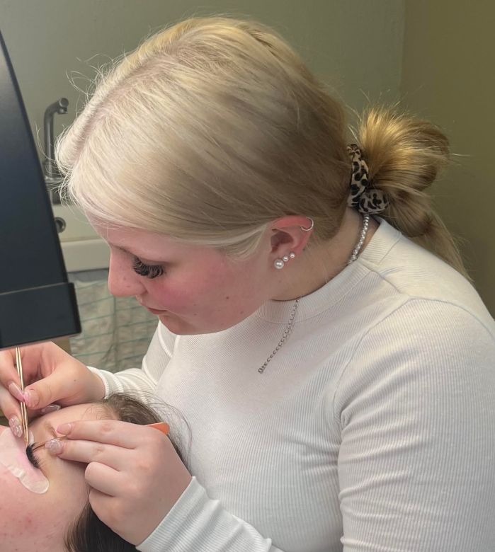 Kosmetologi, ripsiteknikko Eveliina aloitti meillä huhtikuussa 2024. Eveliina tekee meillä ripsien pidennyksiä, jalkahoitoja, kasvohoitoja, käsihoitoja, sokerointeja sekä ripsiin kestotaivutukset ja -värjäykset, kulmiin kestomuotoilut ja -värjäykset. Myös unihieronta ja kiinalainen päänhieronta kuuluvat Eveliinan palveluvalikoimaan. Eveliina suorittaa töiden ohessa myös parturi-kampaajan opintoja.